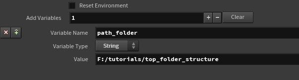 Let’s put down an environmentEdit node between folderstructure and pythonScript node. Create a new env variable called path_folder with a value of F:/tutorials/top_folder_structure like so: